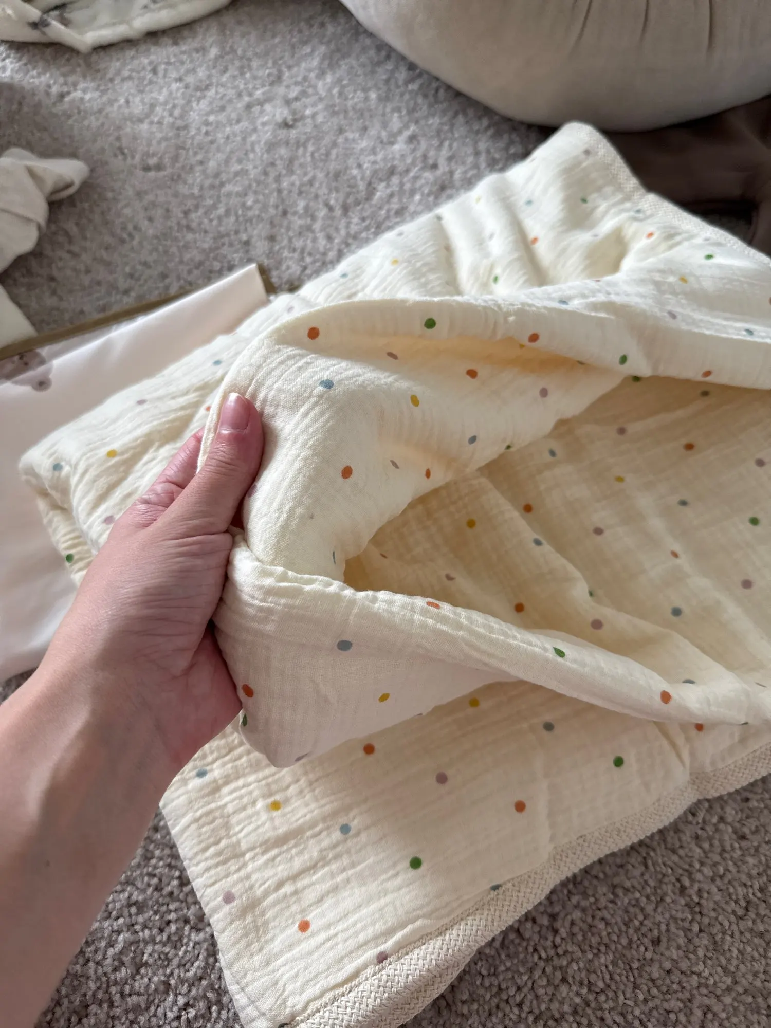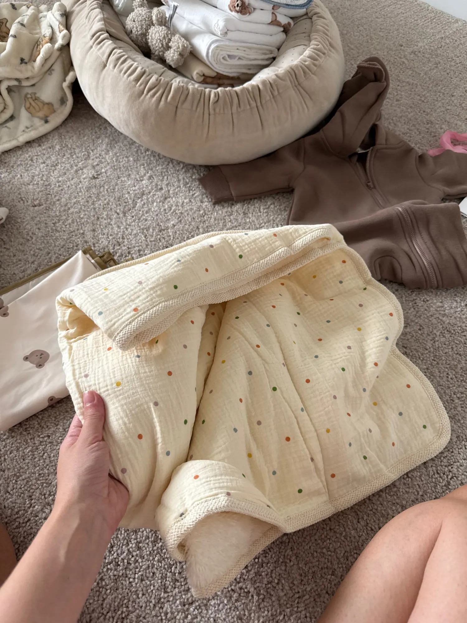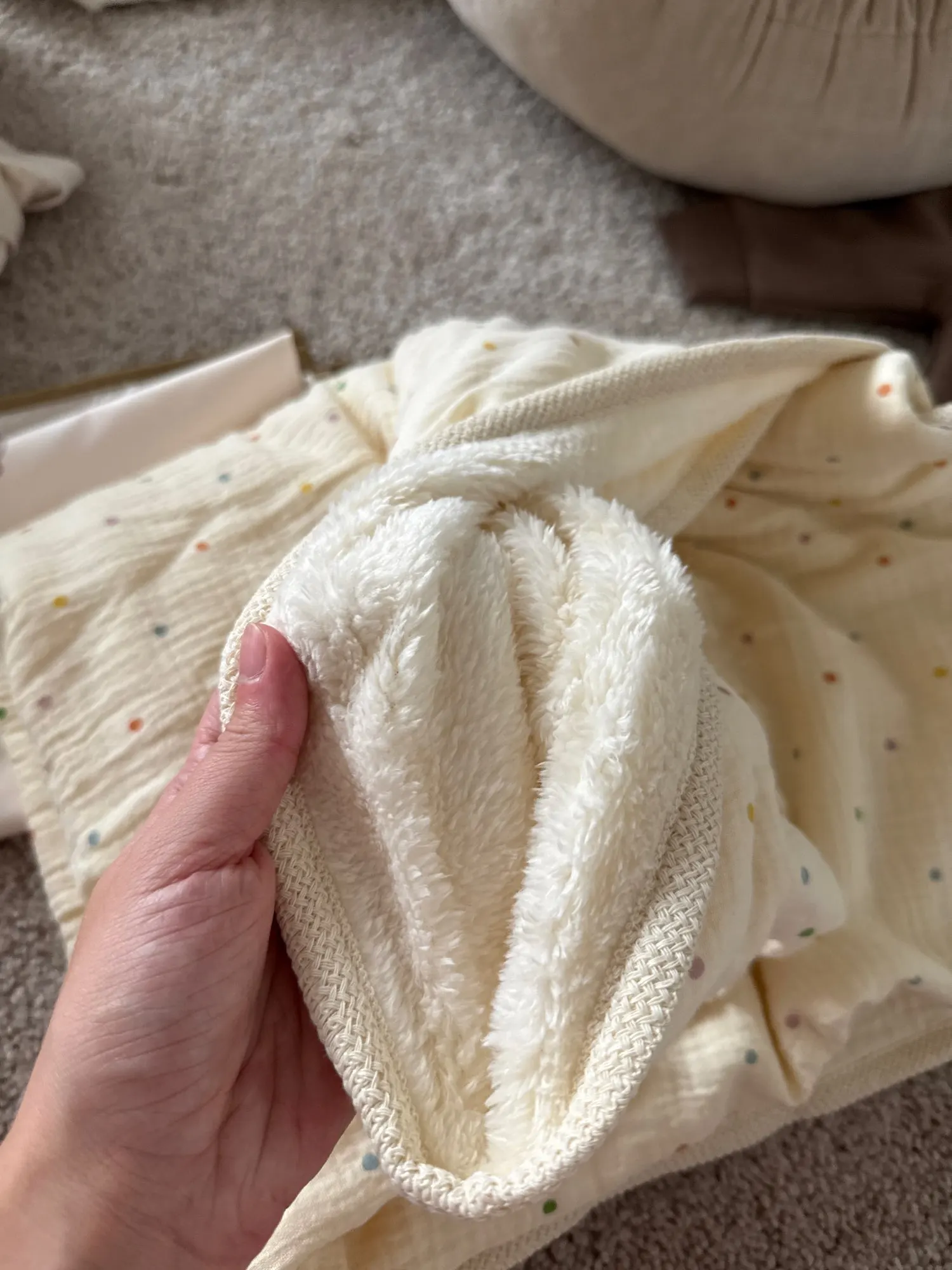 This boho-inspired baby blanket combines gentle fleece with a light muslin touch, creating a cozy layer for naps, stroller rides, or cuddles at home.