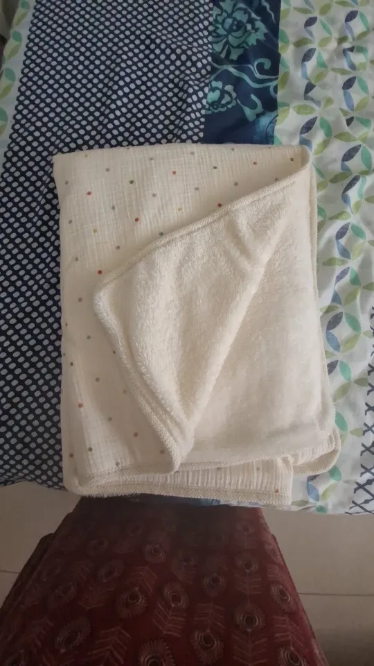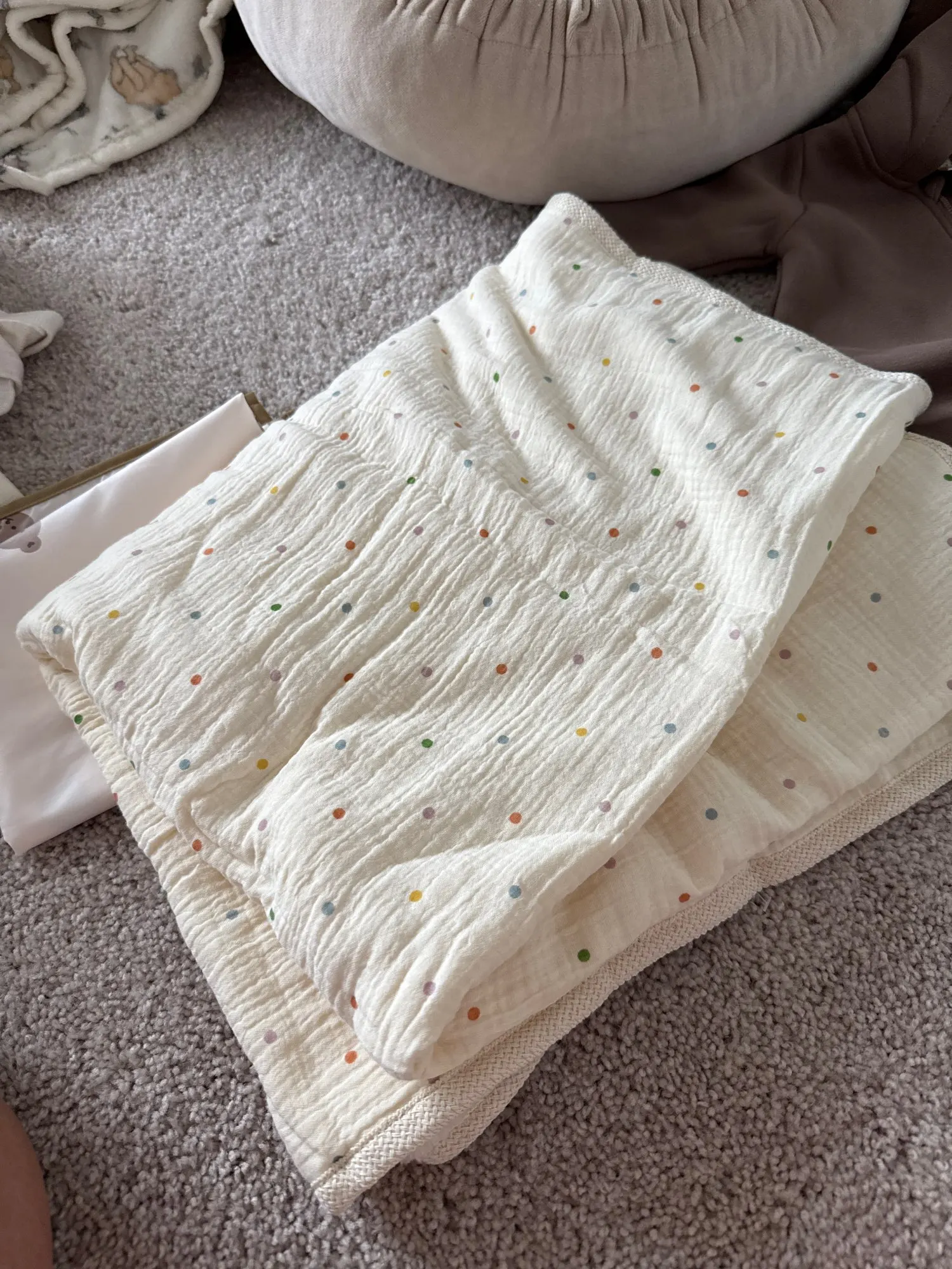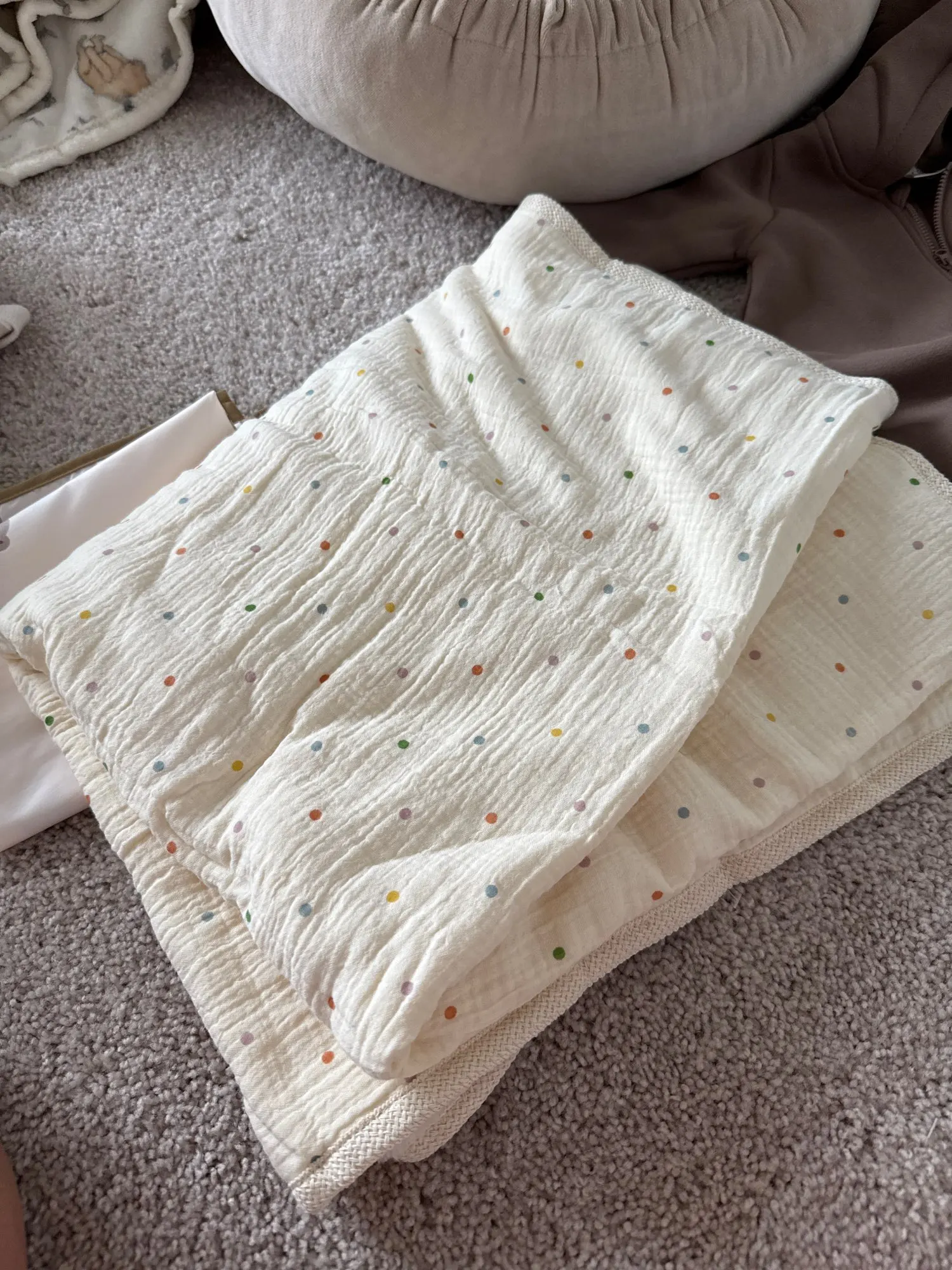 This boho-inspired baby blanket combines gentle fleece with a light muslin touch, creating a cozy layer for naps, stroller rides, or cuddles at home.